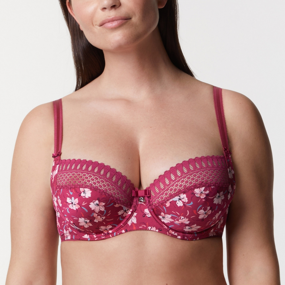 Marbella är en ny modern bh med bygel som är ovadderad. Bh:n har en mycket vacker och elegant spets och ett härligt blommigt tryckt tyg i en fin Cherry nyans.